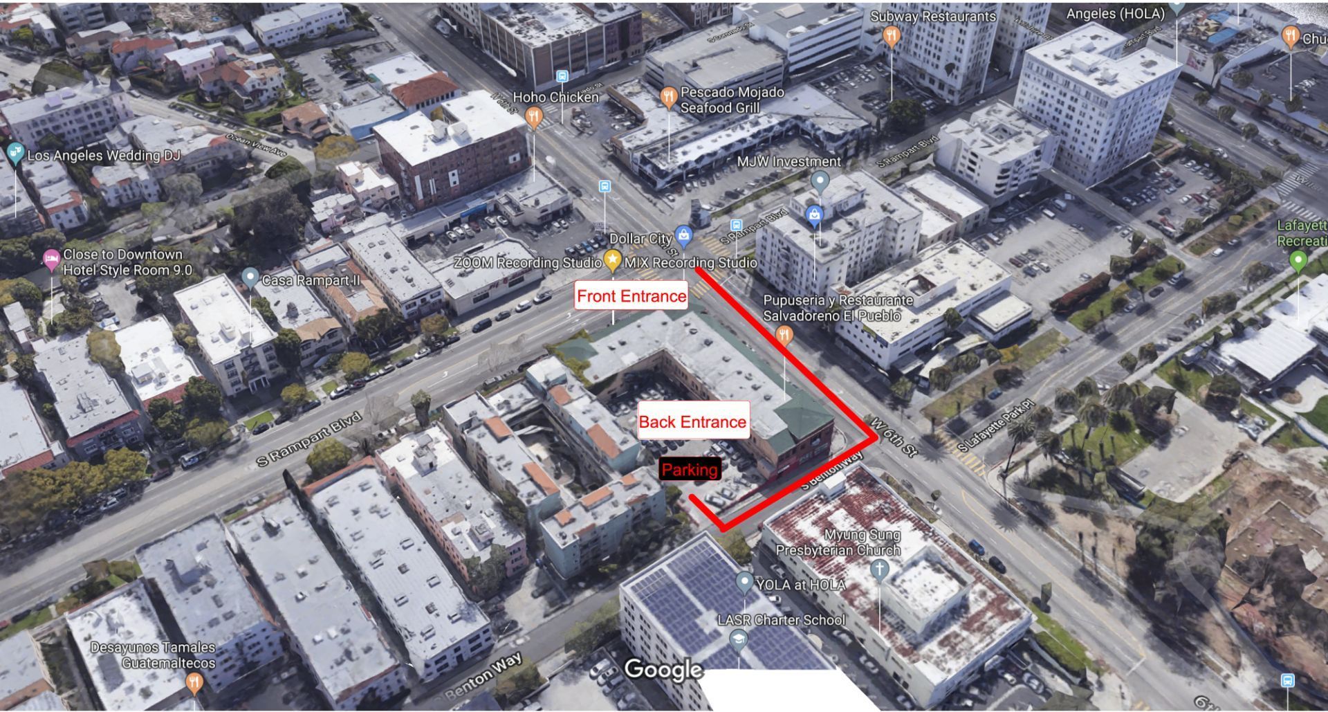 - There is the back entrance from the parking lot on Benton Way, as well as the front entrance from Rampart Blvd.